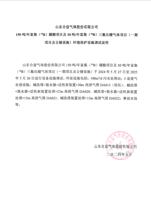山东合益气体股份有限公司 150吨/年富集(10B)硼酸项目及30吨/年富集(10B)三氟化硼气体项目(一期项目及公辅设施)环境保护设施调试说明